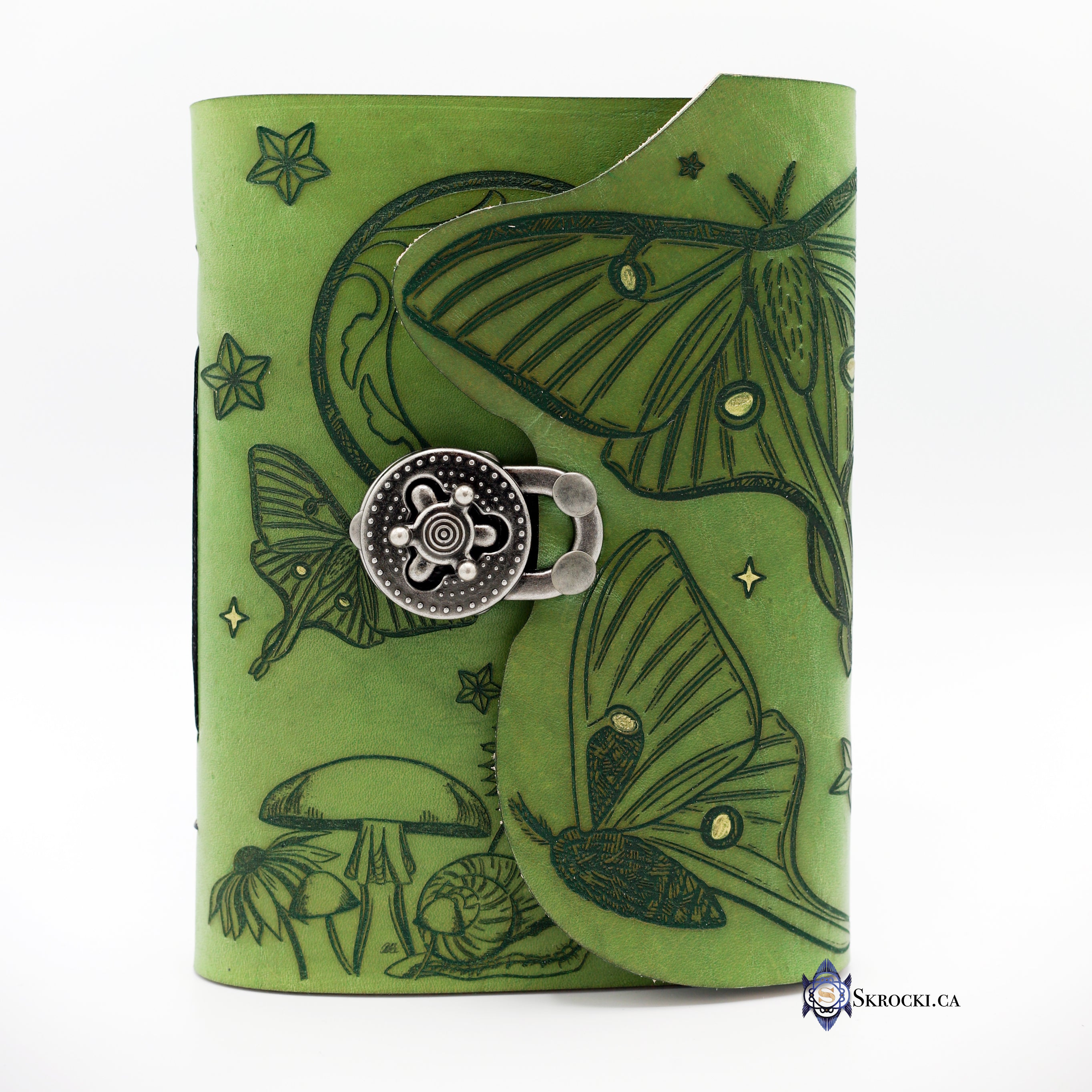 This skull book was handcrafted by Edmonton artist Amy Skrocki (Paragon of Design of Skrocki). The casing for this book was created from top-quality leather, hand carved and tooled, hand-dyed, and hand-bound. The inside cover shows a large stamp that was made in the studio. The pages in this book are acid-free thick cardstock and ideal for writing, drawing, photos, or keepsakes. The book can be rebound when you have filled the pages as well, so the case can be used for a long time. We try to create the pieces we always hoped to find, in this way we have created truly one-of-a-kind pieces that no one else will have.